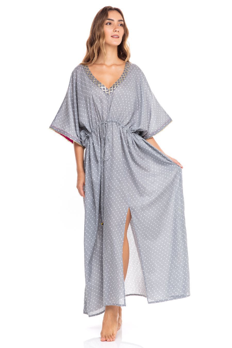 Traditional Indian print on this kaftan in soft cotton fabric. Comes with a waist string for adjustment. Gathers all around. Front slit up to knee length. Colors may vary slightly due to printing. Handmade by artisans in India.