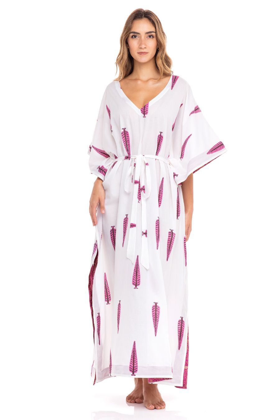 This kaftan has a relaxed silhouette with a waist tie/ adjustable belt. Indian paisley block print in pink color on soft cotton fabric. V neckline and side slits. Detailed with a combination color border. Colors may vary slightly due to printing. Handmade by artisans in India.