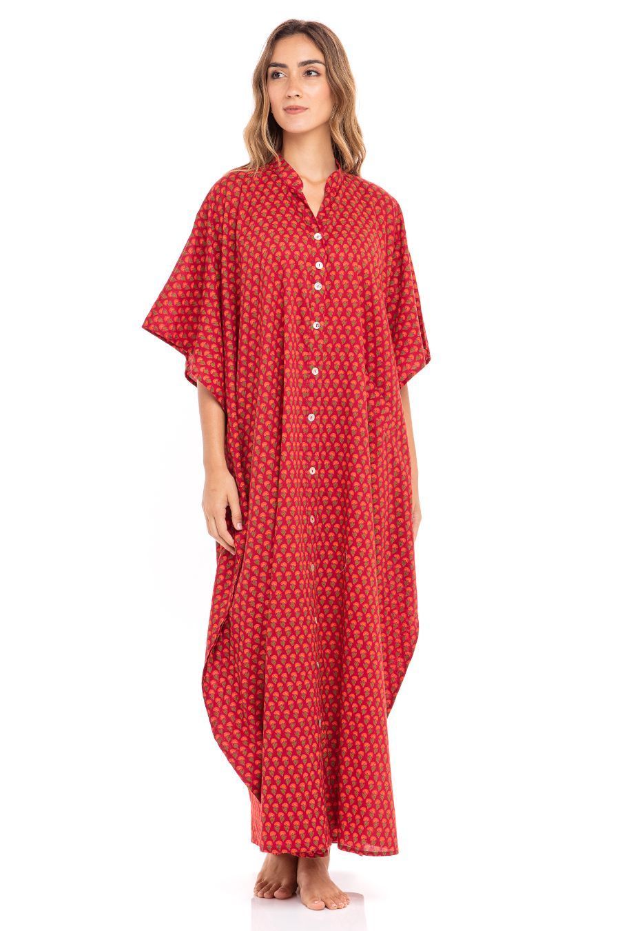 Vibrant red kaftan with pockets in soft cotton fabric. Rounded edges at the bottom with slits and styled with buttons in the front. V neckline with collar band. Don’t forget your sunnies for a day out in this beautiful kaftan or pair it with a pearl necklace for the evening.